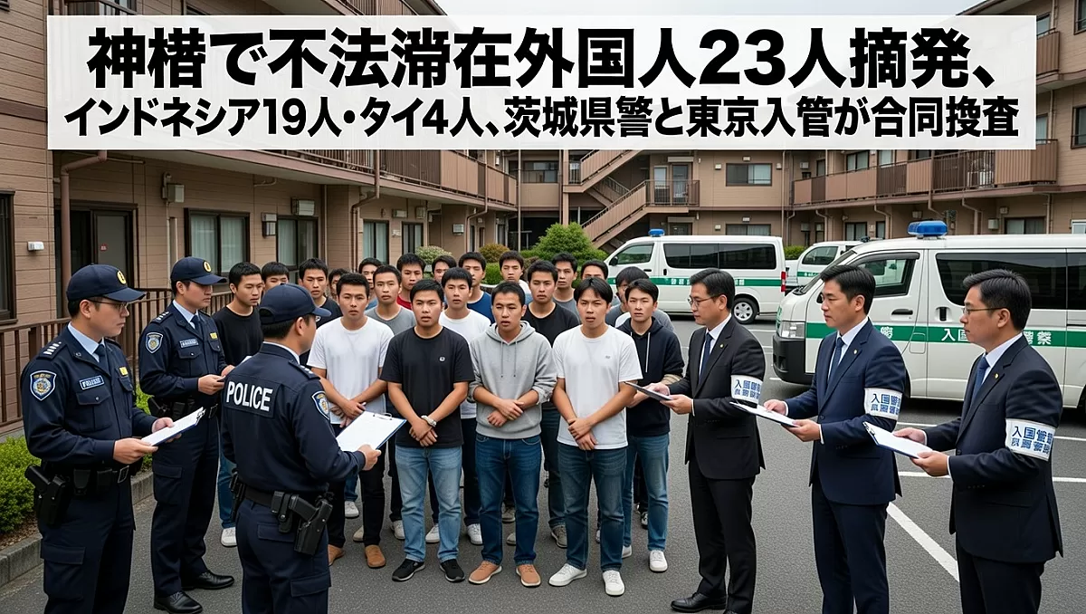 茨城県警神栖署と県警組織犯罪対策2課は2026年1月29日、東京出入国在留管理局(東京入管)と合同で、茨城県神栖市内の集合住宅に住んでいた不法滞在の外国人男女23人を摘発した。
